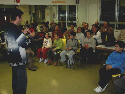 La primera jornada se desarrolló en la tarde del viernes, en el Centro Cívico y en ella "Petu" estuvo preparando la jornada del día siguiente. Nos enseñó, en primer lugar, a regular los prismáticos e indicar cual es su correcto uso. A continuación, pasó ya a exponer con qué pájaros nos podíamos encontrar a la mañana siguiente mediante una impresionante colección de diapositivas y sonidos de aves, destacando los sonidos de llamada que serían los que seguramente oiríamos ya que los cantos de cortejo se producen sobretodo en primavera.